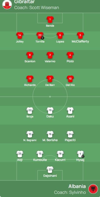 Gjibraltar: Banda, Jolley, Torrilla, Lopes, McClafferty, Scanlon, Valarino, Pozo, Richards, Del Rio, De Barr.