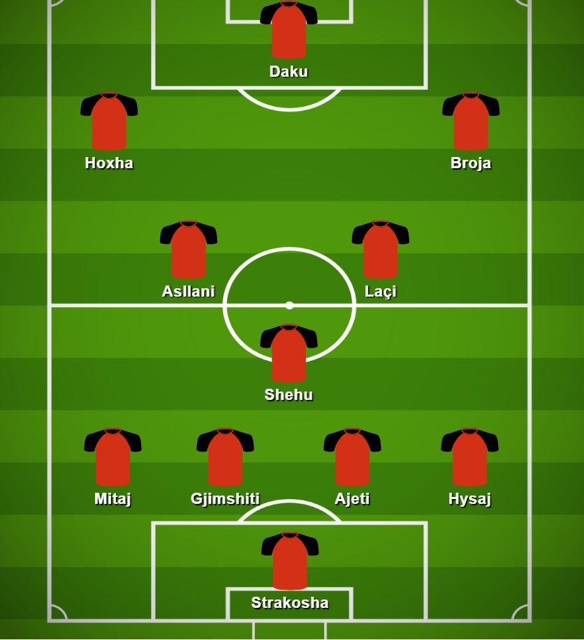 Broja do të luajë në krahun e djathtë, ndërsa në qendër po garojnë për një vend titullari Daku dhe Manaj. Ndeshja do të zhvillohet të martën në orën 20:45 në stadiumin “Air Albania”.