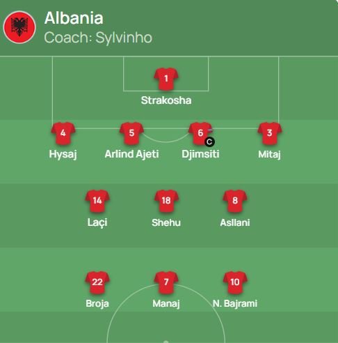 Shqipëria: Strakosha; Hysaj, Ajeti, Gjimshiti, Mitaj; Laçi, Shehu, Asllani; Broja, Bajrami, Manaj.
