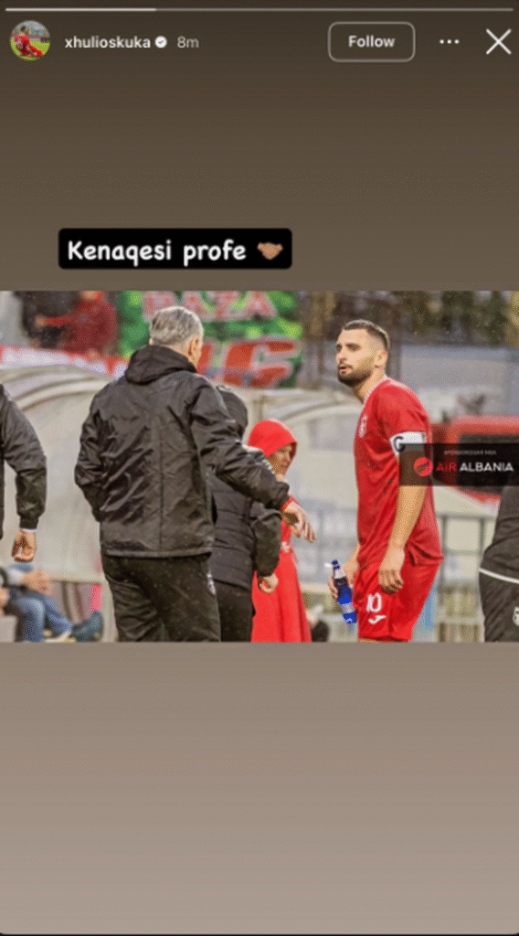 “Kënaqësi profe”, shkruan sulmuesi në Instagram. Ndërkohë që fjalët janë vendosur krah një foto ku shfaqen tekniku 61-vjeçar dhe Skuka.
