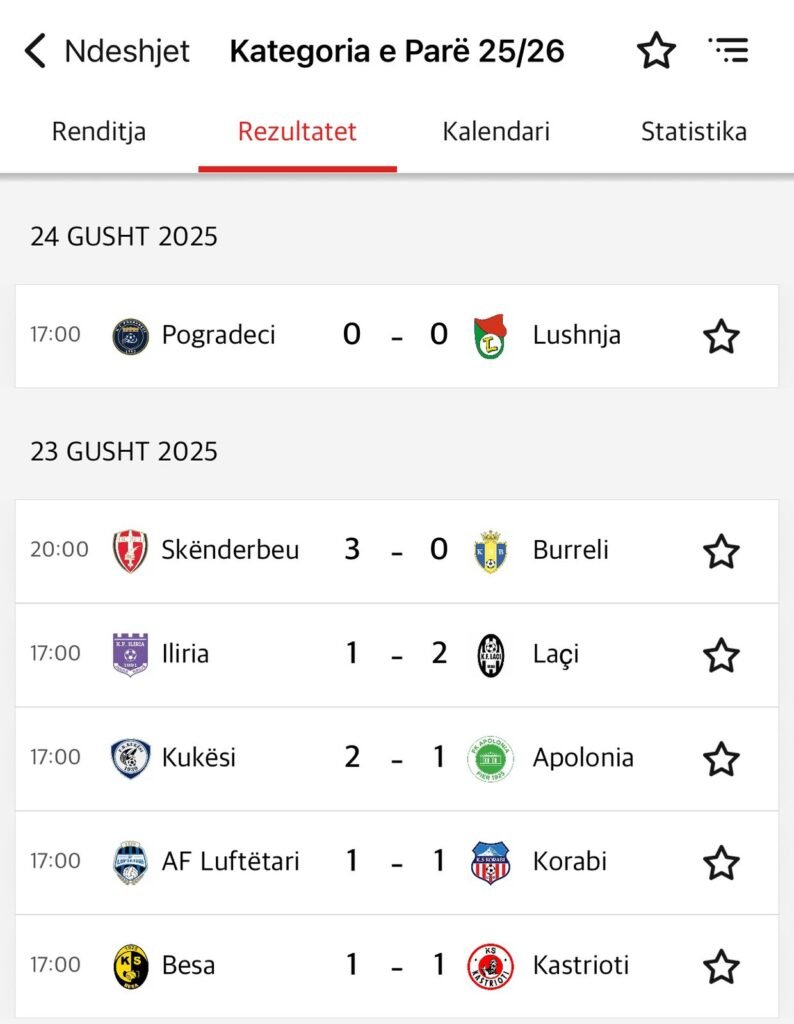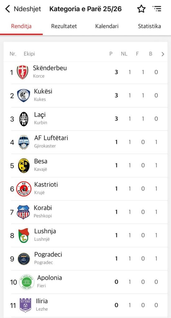 Në vendin e dytë është Kukësi, ndërsa i treti Laçi. Këto janë ekipet e vetme që morën fitoren në javën e parë.