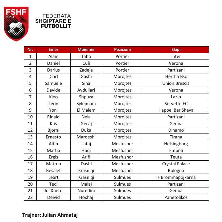 Shqipëria U-19 nis nesër përgatitjet për dy miqësore luksi ndaj Italisë U-19. Trajneri Julian Ahmataj ka grumbulluar 22 futbollistë të datëlindjeve 2007-2008, të cilët kanë qenë pjesë e vazhdueshme e përfaqësueses gjatë këtij viti, duke marrë pjesë në ndeshje miqësore dhe seleksionime të ndryshme.