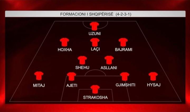 Strakosha; Mitaj, Ajeti, Gjimshiti, Hysaj; Shehu, Asllani; Hoxha, Laçi, Bajrami; Uzuni.