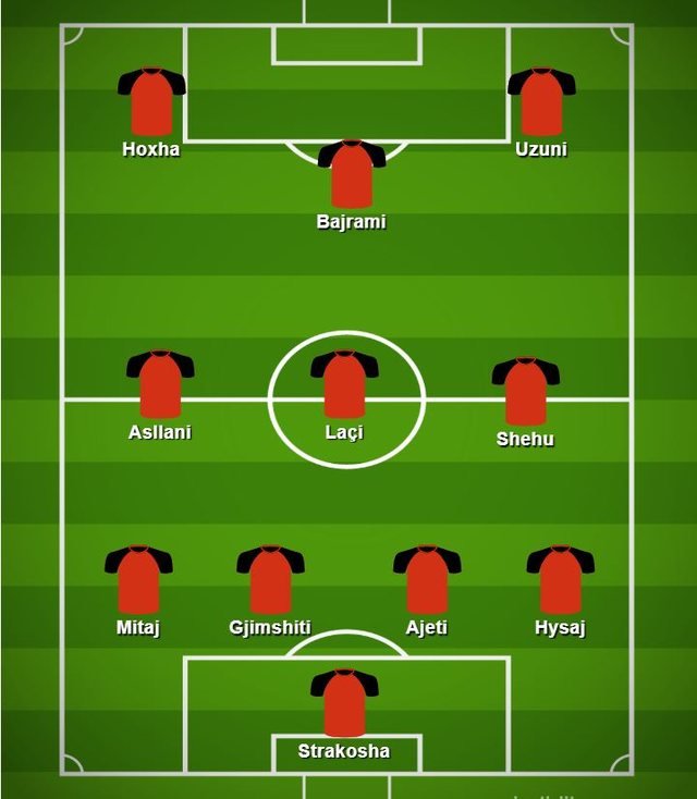 Në krahë do të aktivizohen Mario Mitaj në të majtë dhe Elseid Hysaj në të djathtë. Mesfusha mbetet e njëjtë, me Kristjan Asllanin, Juljan Shehun dhe Qazim Laçin. Në sulm mungojnë Rey Manaj dhe Mirlind Daku për shkak dëmtimi.