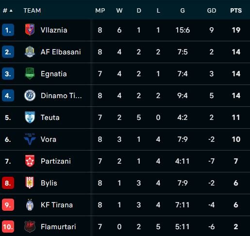 Dy klube me emër, si Tirana dhe Flamurtari, qëndrojnë në fund dhe duket se do të kenë probleme për mbijetesën.