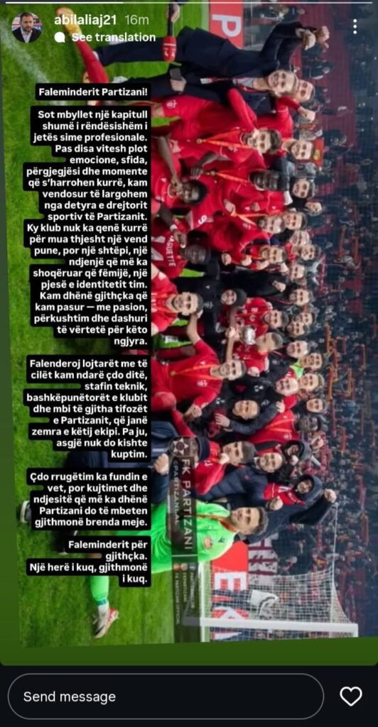 Kujtojmë se 39 vjeçari mori rolin e drejtorit sportiv te Partizanit në korrik të vitit 2023 dhe gjatë kësaj kohe shpesh herë ka bërë edhe rolin e trajnerit, sa herë që të kuqtë kanë mbetur pa një timonier. Por pas më shumë se 2 vitesh, aventurës së tij si pjesë e të kuqve tashmë i erdhi fundi.